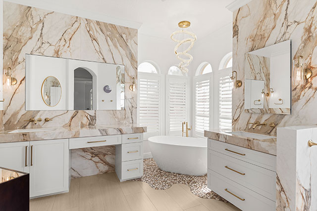 This bathroom feels like a modern spa dressed in quiet luxury. The palette is soft and bright with crisp white cabinetry and walls paired with dramatic veined stone that wraps the vanity backsplash and continues behind the tub. The stone’s warm taupe and gold undertones add movement and richness without overwhelming the space.